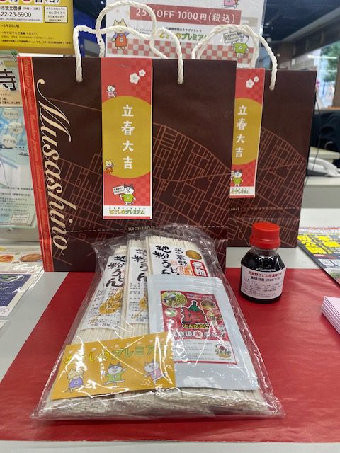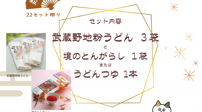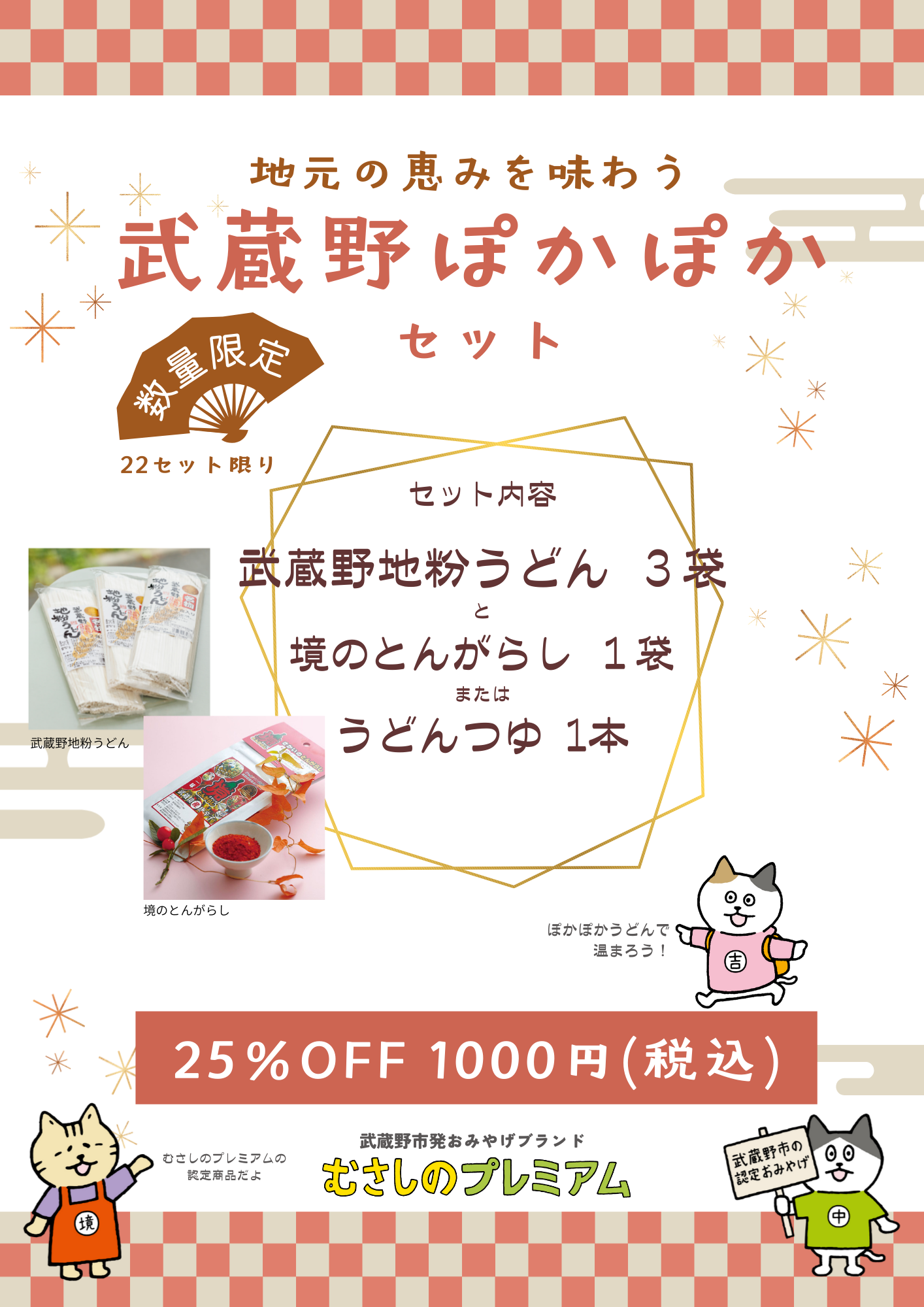 むさしのプレミアム [むさしのプレミアム]むさしの地粉うどんセット販売開始しました 2026/01/27 むー観 コメントする 武蔵野市のおみやげブランド「むさしのプレミアム」認定商品の「むさしの地粉うどん」がお得なセットになりました。その名も「武蔵野ぽかぽかセット」!まだまだ寒い立春に、ぽかぽかうどんのセットはいかがですか? 「うどん3袋」に、「うどんつゆ1本」または「境のとんがらし1袋」が選べます。どちらを選んでも25%オフで1,000円ですよ! 観光機構窓口にて販売中です。 Tweet こちらの記事もおすすめだよ! [むさしのプレミアム]「境のとんがらし」が「さくらごはん」さんにて販売開始! 『むさしのプレミアム』2021年版おみやげ手帳の配布を始めました♪ 2020年版「むさしのプレミアム」おみやげ手帳の配布を始めました♪ 武蔵野のお土産選出プロジェクト”むさしのプレミアム”の一次審査会を行いました
