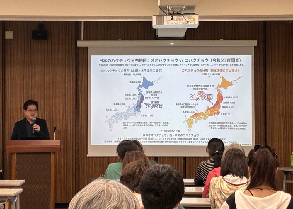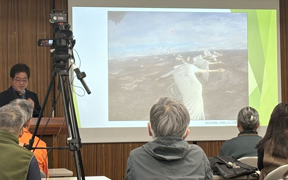 白鳥やガンカモ類などの水鳥をはじめとする地球上の生物種の約40%が生息する重要な生態系として「湿地」が位置づけられており、身近な湿地を守るために何ができるかを考える契機にしてほしい、というメッセージが込められた講演会でした。