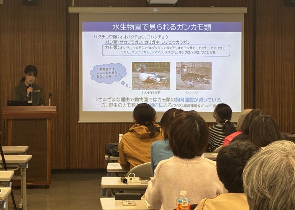 スワンプロジェクトのプロジェクトリーダーである嶋田哲郎さんのお話と井の頭自然文化園の飼育係によるガン・カモ類の繁殖についてのお話でした。