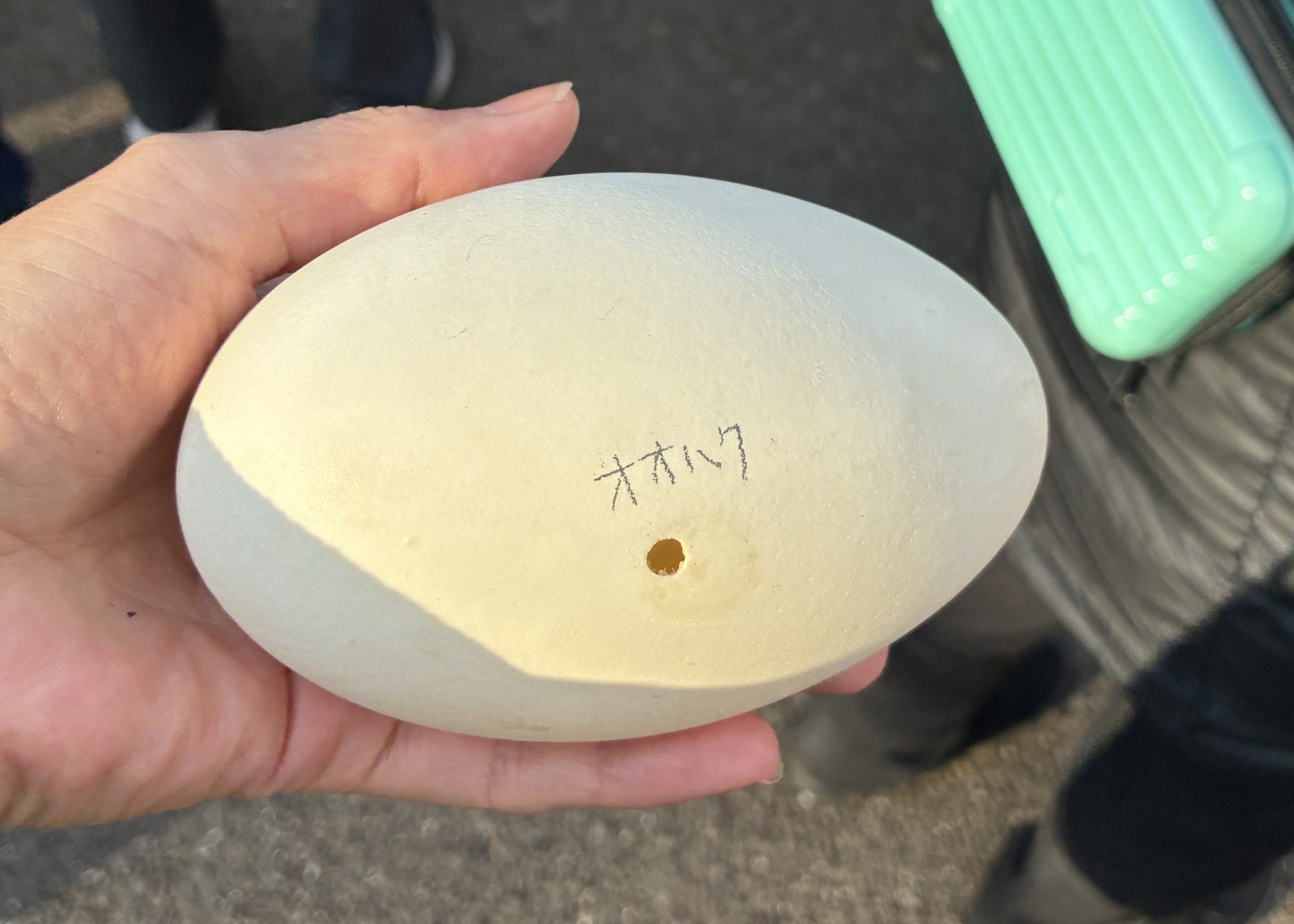 水生物園:水鳥エリアでのガイドも実施され、詳しい解説の他、羽や卵も触らせてもらいました。大きさもこの通り!