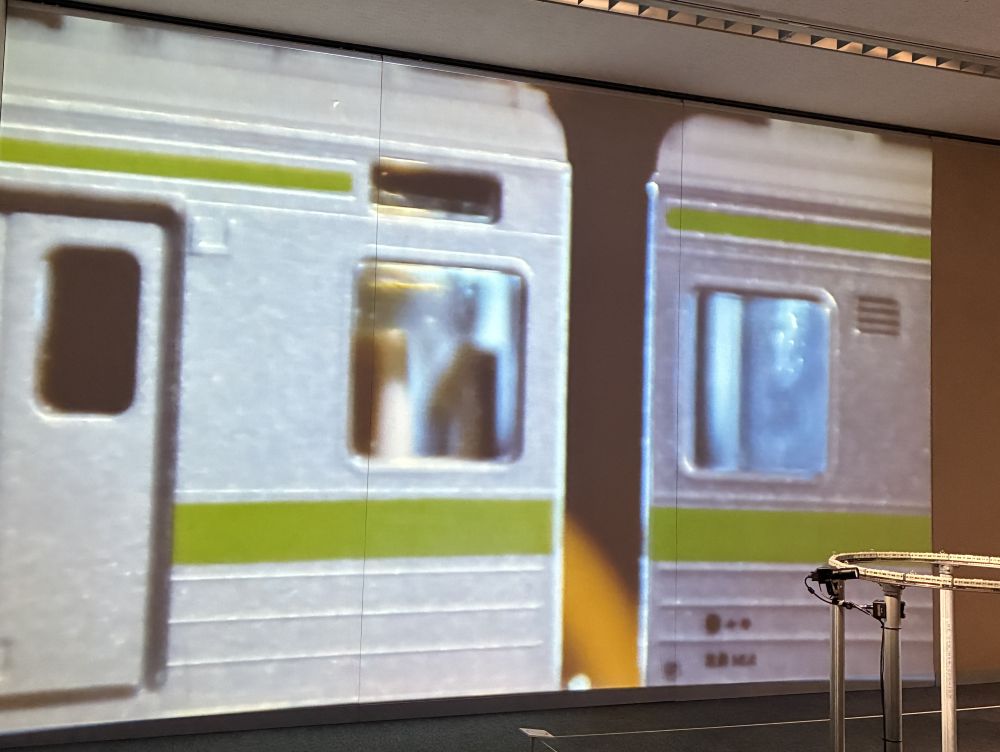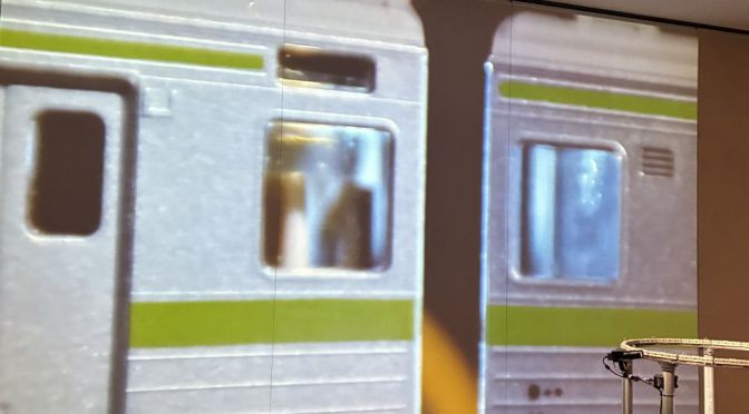 目に飛び込んでくる山手線の見慣れた風景。その様子を撮影し投影されている《光のシークエンス》